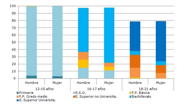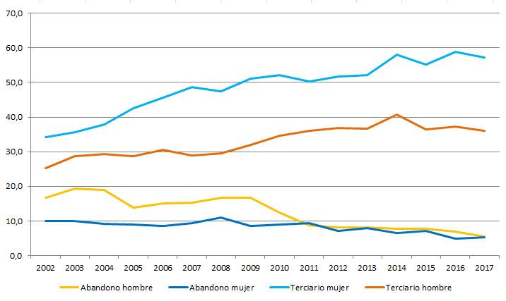 La tasa de población (20 a 24 años) que ha superado, al menos, los estudios secundarios en el año 2017 se cifraba en el 80,1% para las mujeres, y en el 86% para los hombres.