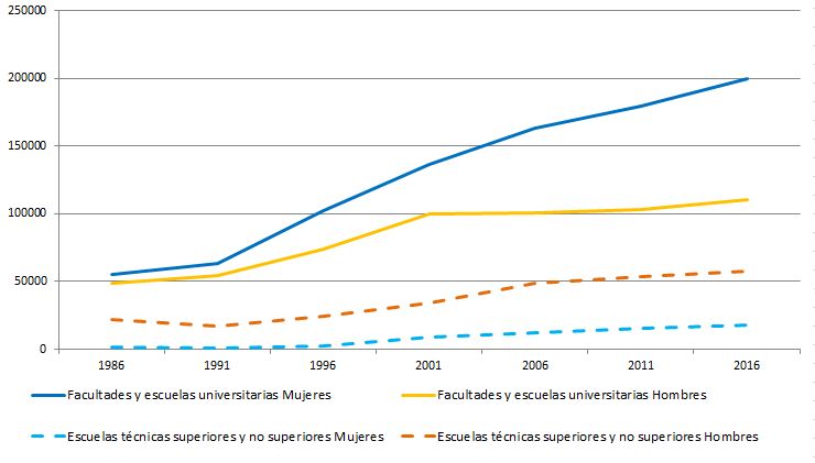 El avance en el número de mujeres con educación superior se manifiesta notablemente en el nivel de las facultades y escuelas universitarias. El número de mujeres con educación superior a nivel de las facultades y escuelas universitarias ha sido y es notablemente mayor que el número de hombres, 118.392 mujeres y 82.714 hombres en las facultades, y también 81.625 mujeres y 27.485 hombres con formación a nivel de escuela universitaria, en el año 2016.