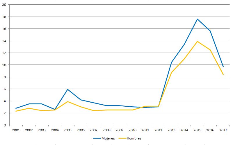 Porcentaje de población (25 a 64 años) en educación permanente. 2001-2017