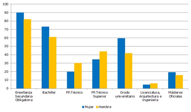 La tasa bruta de graduación es superior en las mujeres respecto a la ESO, Bachiller, Grado universitario y másteres oficiales, mientras los hombres presentan tasas superiores en las F.P. Técnicas -media y superior- y en 'Licenciatura, Arquitectura e Ingeniería', según cifras del curso 2015/2016.