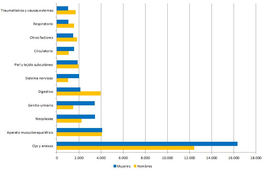 La cirugía ambulatoria no requiere estancia hospitalaria en los centros y en año 2017 se atendió a 75.179 personas, según cifras de Estadística de Morbilidad Hospitalaria; el diagnóstico principal refería a las enfermedades del ojo - 16.320 mujeres y 12.393 hombres-, cataratas principalmente. En segundo lugar se atendieron enfermedades del aparato musculoesquelético (10,8%), dentro de las cuales los trastornos de rodilla en hombres y los juanetes en mujeres, fueron los más frecuentes.