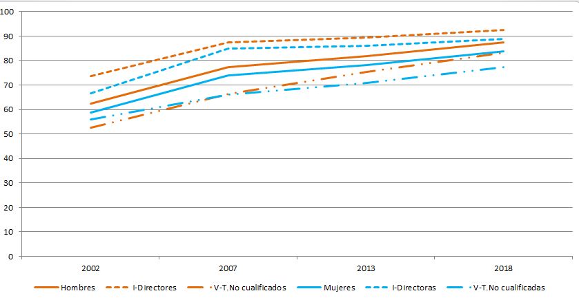 Prevalencia estandarizada de buena salud en la C.A. de Euskadi por sexo y grupo socioeconómico (%). 2002-2018.