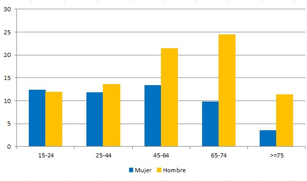 El consumo de alcohol de alto riesgo a largo plazo prevalece entre los hombres entre 45 a 64 años en un 21,4%, y tras la edad de jubilación crece la prevalencia en los hombres y disminuye en las mujeres.