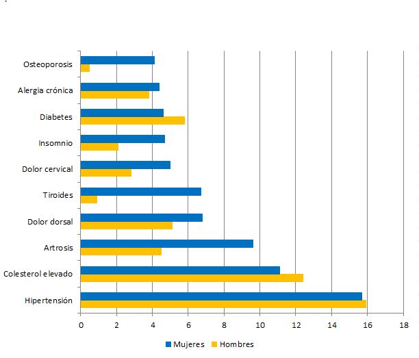 Las enfermedades crónicas de huesos y articulaciones - artrosis, osteoporosis, los dolores dorsales y cervicales- así como los problemas de tiroides parecen afectar más a las mujeres. El colesterol elevado y la diabetes afectan tanto a mujeres como a hombres, si bien la proporción de hombres es algo más elevada.