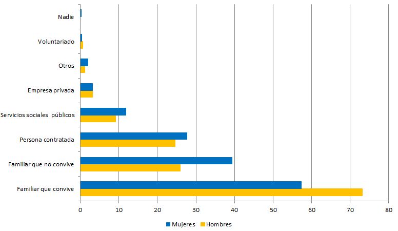 Las personas con limitaciones que necesitan ayuda en su vida cotidiana la encuentran con frecuencia en su entorno familiar. La ayuda prestada al 57,3% de las mujeres y al 73,2% de los hombres que la necesitan fue prestada por alguien de la familia con quien convive; además, el 39,4% de las mujeres y el 25,9% de los hombres fue ayudado por alguien de la familia con quien no convive. En otros casos, al 27,7% de las mujeres y al 24,6% de los hombres les ayuda una persona contratada al efecto.