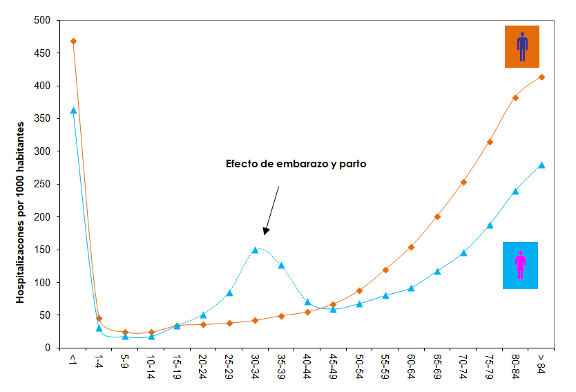 Así mismo, la edad promedio de hospitalización de los hombres, fue más temprana que en las mujeres y la diferencia mayor se localizó en las hospitalizaciones debidas a traumatismos y lesiones (54 años en los hombres, frente a los 67 de las mujeres).