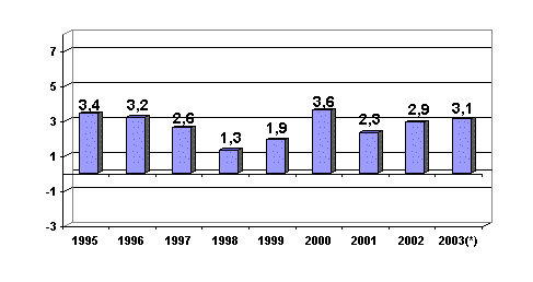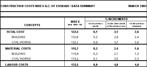 Among raw material prices that rose most in March 2003 were: Asphalt products (5.4%), Plastic piping (3.8%) and Lime, gypsum and plaster (1.7%). On the other hand, average monthly prices fell for raw materials of Metal Piping (-1.2%), Paint and varnish (-0.9%), Oil by products (-0.9%) and Glass (-0.7%), amongst others.