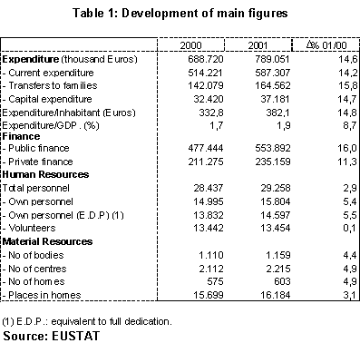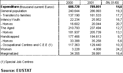 Among the wide range of centres, classified according to the type of need attended, the majority group (27%) consisted of residential centres (residences, functional households, hostels, etc. ), 603 altogether, that offered 16,184 places and employed 6,723 workers. Expenditure on these centres came to 276 million euros, 35% of total expenditure.