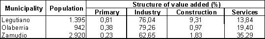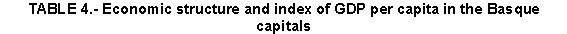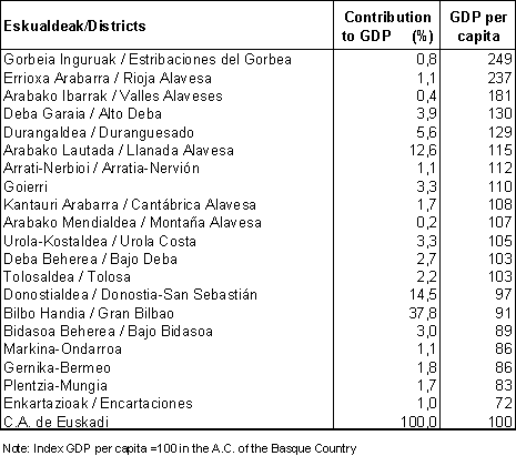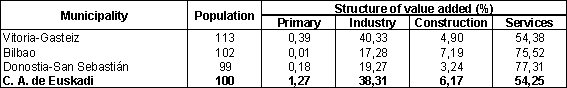 Of the Basque capitals, Vitoria-Gasteiz has a 13% higher GDP per capita than the Basque average, Bilbao 2% higher and Donostia –San Sebastián almost the average. The former bases its hegemony on a powerful and modern industry that provides over 40% of its GDP, while Bilbao and Donostia-San Sebastián base their economic structure on the services sector, over 75% of its GDP is generated by this sector, and where the industrial contribution is very low, around 18%, more than 20 percent below the Basque average.
