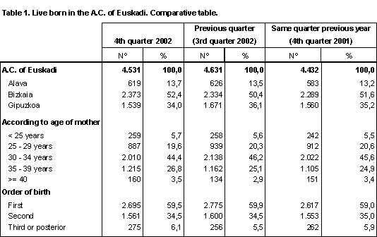 Provisional data on Birth Statistics 2002 sets the number of births at 18,051, which without the information referring to births of Basque residents outside the A.C. of the Basque Country, represents a 2.3% increase with regard to 2001, according to Eustat data.