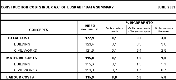 According to data made available by EUSTAT the Construction Costs Index in the A.C. of the Basque Country increased by 0.1% in the month of June 2003 compared with the previous month, leaving the inter-annual rate for June at 3.3%. The rate for the first six months since last December has registered an increase of 3.0%.