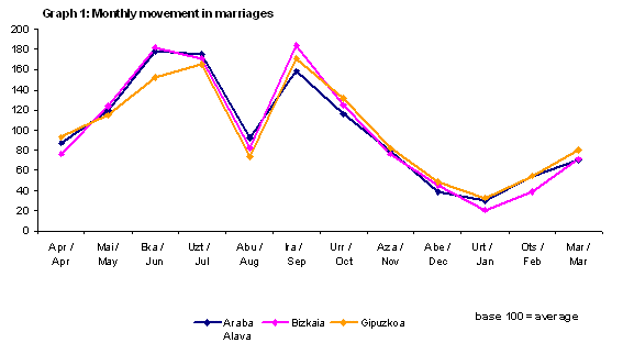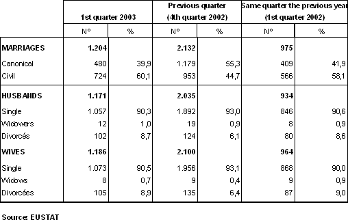 As in recent years, in this quarter the highest proportion of marriages were civil, which seems to consolidate this fact. By provinces, the highest proportion of civil weddings corresponded to Alava (73%), which represents a very significant increase with regard to the same period the previous year, when the figure was 64%. Bizkaia and Gipuzkoa, with 59%, maintain the same percentage as in the first quarter of 2002. In the case of residents outside the Autonomous Community that held weddings in the Community, the percentage was 30%.