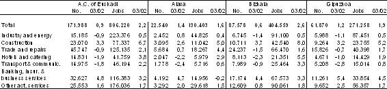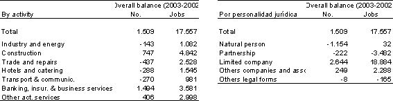 The structure by size of employment has hardly varied, even if we go back several years. In 2003, 128,141 establishments, almost three-quarters of the total, did not reach 3 jobs, although they accounted for 18.9% of total employment. At the other extreme, establishments with 50 or more employees came to 2,136, or 1.2% of the total, accounting for 308,135 posts, 38.2% of total employment.