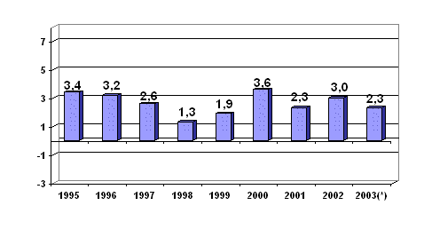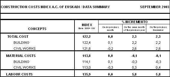 As for raw material prices, among the most inflationary rates for September 2003 were: Asphalt products (5.4%), Metal piping (1.0%), Lime, gypsum and plaster (1.0%), Machinery accessories (0.6%), Oil and grease (0.5%) and Paint and varnish (0.3%). By contrast, average monthly prices fell for the following raw materials: Oil by-products (-4.7%), Cleaning and hygiene material (-2.1%), Explosives and gases (-0.8%) and Mining arids (-0.3%).