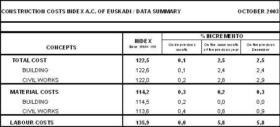 The Construction Costs Index for the A.C. of the Basque Country rose 0.1% in October 2003 with regard to the previous month, making a 2.5% rise in the inter-annual rate for the month, according to EUSTAT data. The rate for the first ten months of the year, in relation to last December, underwent the same rise of 2.5%.