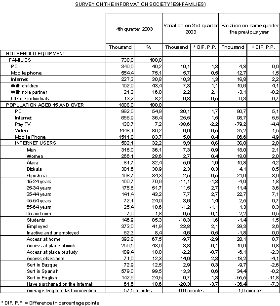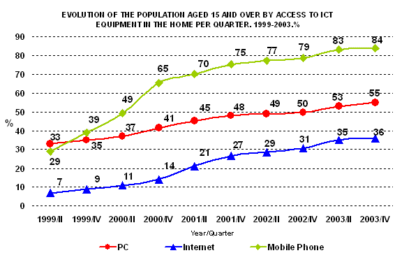 There was an important recovery –an increase of 25.6%- in the number of connections made in other locations, such as libraries, civic centres or cyber cafés, etc. However, this still did not reach the levels of late 2002, when these alternative places were used by 16.4% of users, compared to the current 12.3%.