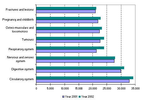 In comparison with 2001, there was a substantial increase in hospital admissions due to respiratory diseases (13.4%) and, especially, cases of chronic bronchitis, which grew 19.5%. This fact jeans that respiratory diseases move up from seventh to fourth position in the ranking of diseases which lead to hospital admission, ahead of the group of tumour diseases, osteo-muscular and complications in pregnancy and birth. Of the rest of the most frequent diseases, there was a 6.1% increase in admissions with regard to the previous year.
