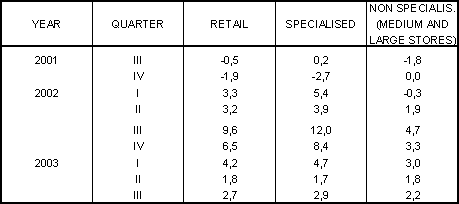 By provinces, the greatest growth in nominal sales for the retail sector in the third quarter of the year was in Alava, with an inter-annual rise of 6.0%, due to growth in specialist retail trade (6.6%); next comes Bizkaia with a positive variation of 4.4% on the general index, while Gipuzkoa obtained more moderate results of 3.7%. In real terms, growth was 4.0% in Alava, 2.8% in Bizkaia and 1.9% in Gipuzkoa.