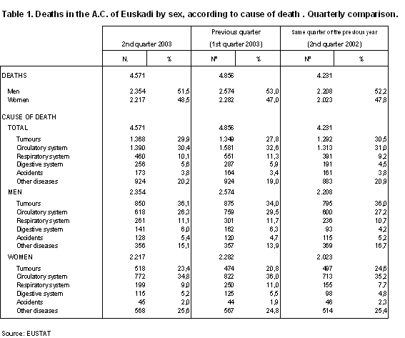 The natural population growth in the second quarter of 2003 was positive, with an increase in the population by 409 persons. By Provinces, positive balances were registered in Alava and Gipuzkoa, which increased in population by 206 and 267 inhabitants, respectively. In the case of Bizkaia, on the other hand, the number of deaths was higher than that of births (-64).