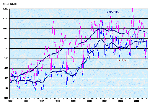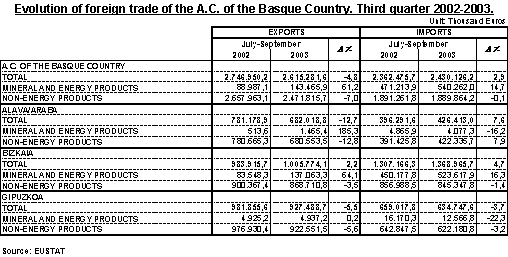 Among the import duty groups, Capital goods, the most important in terms of volume, suffered a 6.4% reduction in exports, while there was a 2.3% increase in its imports. Metals and manufactured, the second most important group, exported 7.3% less than in the same period in 2002 and imports of these products fell by 0.7%. All the import duty groups, apart from Energy products, reduced exports during the third quarter.