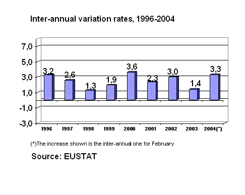Among raw material prices used by the sector to undergo the highest rates of inflation over the twelve-month period were: Lime, gypsum and plaster (9.2%), Iron and steel (8,2%), Cement by-products (7.4%), Metal piping (5.6%) and Paint and varnish (5.5%). On the other hand, there were reductions in inter-annual prices (February 2004 over February 2003), for raw materials used in Oil by-products (-14.8%), Asphalt products (-13.5%), Worked stone (-5.0%), Electric energy (-3.7%) and Office material (-3.2%).