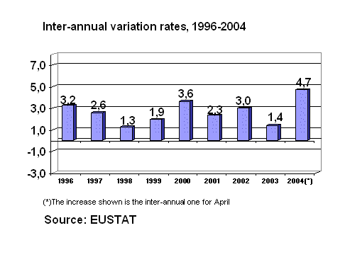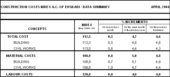 Among prices of raw materials consumed by the sector to undergo the highest inflation rates over the twelve months as a whole are: Metal piping (23.6%), Iron and steel (15,8%), Oil by-products (9.0%), Asphalt products (8.2%) and Lime, gypsum and plaster (8.0%). On the other hand, reductions in inter-annual prices (April 2004 over April 2003) were registered for the raw materials of Electric energy (-8.5%), Worked stone (-5.0%), Office material (-3.4%) and Explosives and gases (-1.8%), among others.