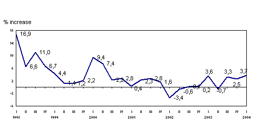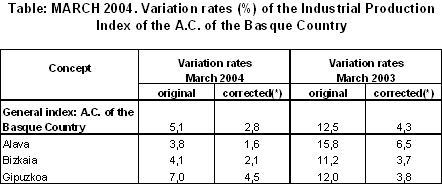 In March 2004, the most positive inter-annual variations, in absolute terms corresponded to the sectors of "Oil refining" (69.8%), "Electric energy, gas and water" (38.1%), "Textiles and clothing" (10.6%), "Electric material" (9.3%) and "Rubber and plastic" (6.4%). Conversely, the sectors to experience the most negative inter-annual rates were "Non-metal industry" (-9.2%), "Metal and non-metal minerals" (-9.0%), "Leather and footwear industry" (-5.4%), "Chemical industry” (-2.5%) and "Other manufactured" (-1.5%).
