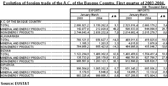 The most sizeable customs duty sections, in the A.C. of the Basque Country as a whole, were those who contributed to the positive evolution of quarterly exports: Transport material increased its overseas sales by 23.9%, Electric material by 4.5%, Metals and manufactured by 5.2% and Plastic and rubber by 1.8%, to mention the most important ones. As for imports, Metals and manufactured increased by 6.1%, Mineral products by 26.7%, Electric material by 0.8%, but Transport material fell by 30.2%.