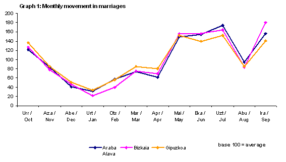 There was a notable increase in the number of weddings held in church in the third term. Compared to the winter months, when more than half the ceremonies were civil, in this period 71.2 % of weddings held were religious. In Alava church weddings accounted for 64.3% of the total, in Gipuzkoa it was 68% and in Bizkaia the figure was as high as 73.6%.