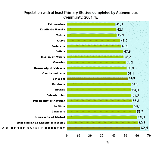 62% of the population of the A.C. of the Basque Country had completed compulsory education, heading the list of communities as regards the level of studies completed and coming third in university degrees (13.3%), behind the Community of Madrid and Navarre, according to the Population and Housing Census 2001 published by Eustat, corresponding to the section on Level of Education.