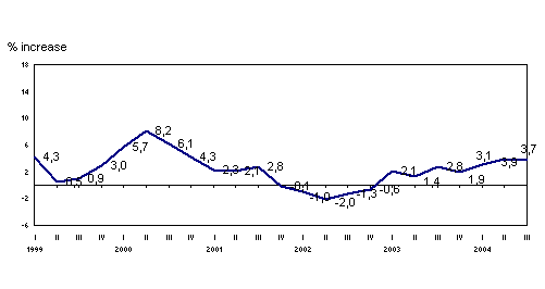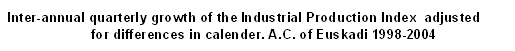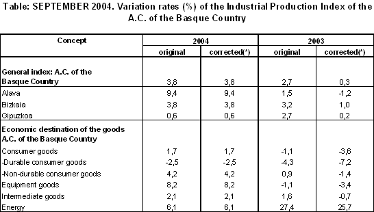 In September 2004 the most positive inter-annual variations, in absolute terms, corresponded to "Transport material" (17.6%), "Electric energy, gas and water” (14.0%), "Leather and footwear industry" (9.9%), "Paper, publishing and graphic arts" (8.5%) and "Machinery" (7.0%) and, on the other hand, the sectors with negative inter-annual variations were "Textiles and clothing" (-26.5%), "Non-metal industry" (-17.9%), "Oil refining" (-11.3%) and "Metal and non-metal minerals" (-10.9%), among others.