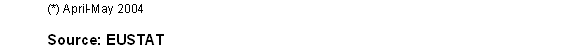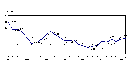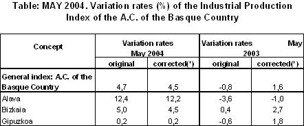 In May 2004, the most positive inter-annual variations, in absolute terms, corresponded to the sectors of "Electric energy, gas and water" (26.1%), "Electric material" (14.9%), "Paper, printing and graphic arts" (8.5%), "Rubber and plastic" (7.3%) and "Transport material" (5.4%). Conversely, the sectors to experience negative inter-annual rates were "Non-metal industry" (-32.2%), "Metal and non-metal minerals" (-25.5%), "Leather and footwear industry" (-12.8%), "Other manufactured" (-4.8%), "Timber industry" (-2.6%) and "Food industry" (-0.5%).