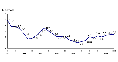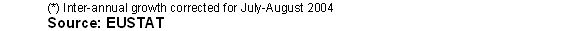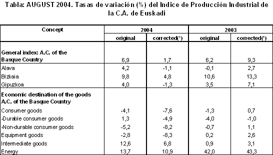 The most positive inter-annual variations, in absolute terms, for August 2004 corresponded to the sectors of "Electric material" (22.8%), "Electric energy, gas and water" (21.4%), "Timber industry" (17.2%), "Non-metal industry" (13.5%) and "Rubber and plastic" (12.8%). On the other hand, the sectors to undergo negative inter-annual rates were "Leather and footwear industry" (-42.5%), "Transport material" (-20.5%), "Food industry" (-13.6%), "Textiles and clothing" (-1.0%) and "Oil refining" (-0.1%).