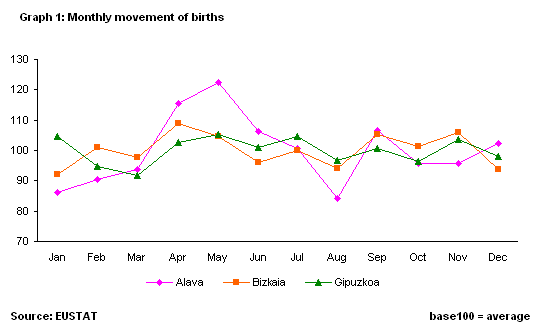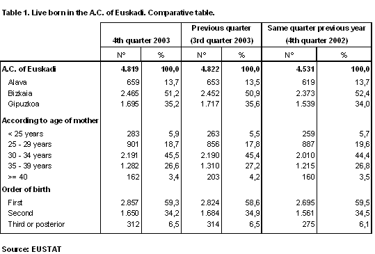 Of the 4,819 children who were born in the A.C. of the Basque Country in the fourth quarter of 2003, 6.4% more than in the fourth quarter of 2002, 1,611 were born in October, 1,635 in November and 1,573 in December. By province, 659 children were born in Álava, 2,465 in Bizkaia and 1,695 in Gipuzkoa, an increase for all three provinces in relation to the same quarter of the previous year.