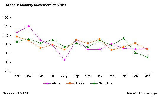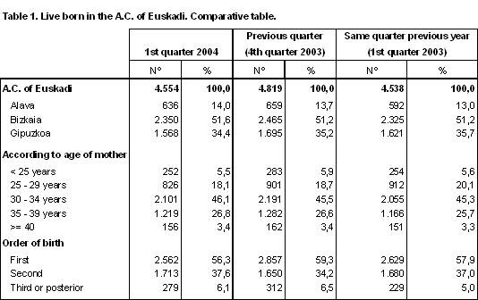 During the first quarter of 2004, figures for Birth Statistics, devised by EUSTAT, gave the number of births in the A.C. of the Basque Country as 4,554, similar to that obtained in the same period of the previous year. By province, 636 children were born in Álava, a growth of 7% and in Bizkaia, with 2,350 births, the percentage of growth came to 1%. On the other hand, Gipuzkoa decreased by a proportion of 3%, with 1,568 births.