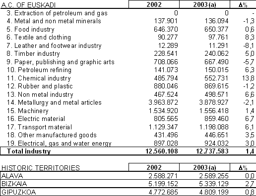 According to Eustat data industrial activity in the A.C. of Euskadi registered real growth in added value of 1.4% in 2003, improving on the figure for the previous year (+0.2%). This performance was not equal in the three provinces, Bizkaia and Gipuzkoa returning real growth rates of 2.7% and 0.8% respectively with Alava maintaining the level of last year.