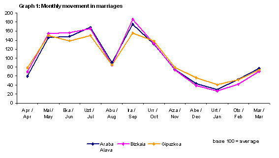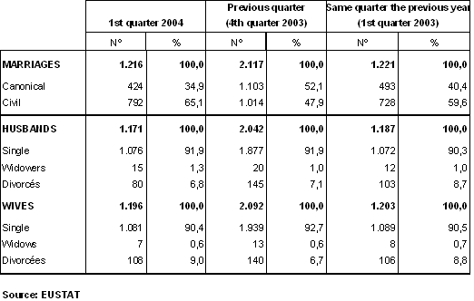 Of the 1,216 weddings held in the first quarter of 2004, 1,171 of the men and 1,196 of the women were resident in the A.C. of the Basque Country. For 1,076 grooms (92%) this was their first marriage, while 15 widowers and 80 divorcés remarried. The percentage of women for whom this was their first marriage was similar to that of men: there were 1,081 first-time brides, 7 widows and 108 divorcées.