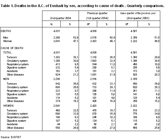 The main cause of death was circulatory system illness, of which 1,302 people died (30,1%); this was very closely followed by the next most common cause, which was tumours, giving rise to 1,298 deaths (30%). In third place was respiratory illness, causing 413 deaths over these three months (9.5%).