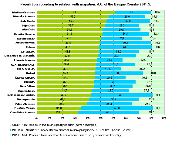 46.4% of the population resident in the A.C. of the Basque Country live in their town of birth, i.e. they are sedentary. The rest are divided between 31% that come from another town in the A.C. of the Basque Country –internal migrant- and 22.6% that come from another Autonomous Community or from third countries –immigrants-.