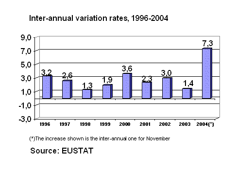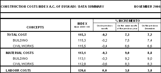 In November the highest growth in prices corresponded to raw materials consumed by Electric energy (4.9%), Office material (1.1%), Glass (0.7%), Metal piping (0.6%) and Lime, plaster and gypsum (0.4%). Prices of raw materials fell, however, for Oil by-products (-8.0%), Asphalt products (-8.0%), Oil and greases (-1.6%) and Iron and steel (-0.7%), among others.