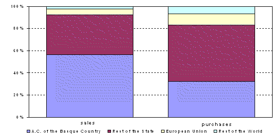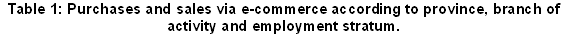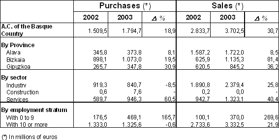 Going into greater detail, it can be seen that, by Province, the outstanding turnovers were in Alava, in terms of sales, and Bizkaia for purchases. By branch of activity, industry outshone the other sectors as regards sales, while in purchases, industry and services obtained similar figures, with irrelevant figures for the construction sector. Lastly, and bearing in mind the size of the establishment, we can see that the highest figures as regards the use of e-commerce were in those with 10 or more employees.