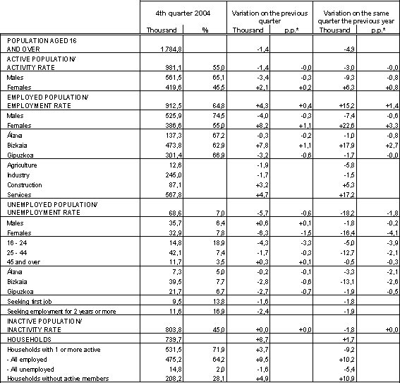 The number of people out of work, which stood at 68,600 in the fourth quarter, fell in all three provinces. In Bizkaia 39,500 were registered as being jobless, 2,800 less than three months previously, although its rate of 7.7% continued to be the highest of the three provinces. The jobless figure in Álava, with a total of 7,300, remained practically unchanged from the previous quarter, giving an unemployment rate of 5%, the most positive of the three provinces. The number of unemployed in Gipuzkoa fell by 2,700 giving a 6.7% unemployment rate and leaving 21,700 people out of work.