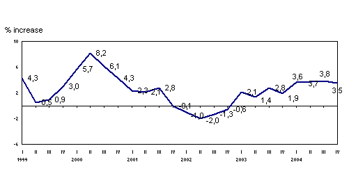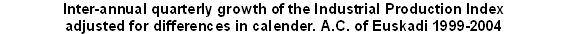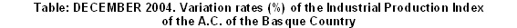 The most positive inter-annual variations in December 2004, in absolute terms, corresponded to the sectors of “Electric energy, gas and water” (21.2%), “Metal and non-metal minerals” (4.1%), “Food industry” (4.1%), “Transport material” (3.5%) and "Rubber and plastic" (2.7%).