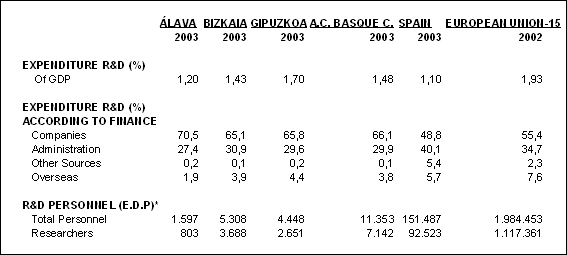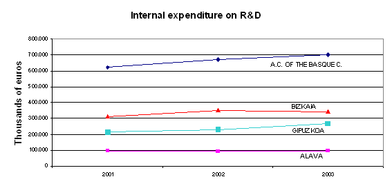 The importance of funding by companies themselves (66.1%), as regards private resources earmarked for research, situated all three provinces above the state average (48.8%) and at the level of countries such as Germany, USA, Switzerland and Belgium. If we look at funds coming from abroad in 2003, 29 million euros less were received than in 2002, which represented 3.8% of the total.