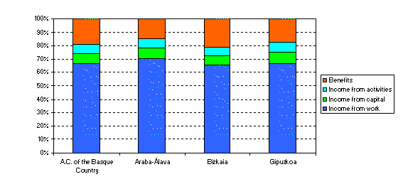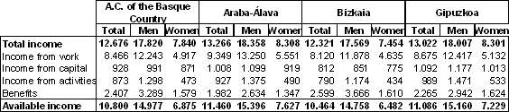 The municipality in the A.C. of the Basque Country with the highest average personal income was Laukiz, with 23,363 euros, situated in the province of Bizkaia. In Gipuzkoa, the municipality with the highest personal income was Leintz-Gatzaga, with 18,094 euros and in Álava the highest personal income was to be found in Zigoitia, with 16,923 euros. Conversely, the lowest personal incomes were in Karrantza in Bizkaia, with 8,087 euros, Lapuebla de Labarca in Álava, with 8,640 euros, and Pasaia in Gipuzkoa, with 9,879 euros.