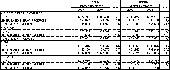 The trade balance with the European Union, contrary to the results of the total balance, improved slightly, rising from 469.8 million euros in the fourth quarter of 2003, to 498.0 million in the last quarter of 2004, thanks to the improved exchanges with our principal customers, France and Germany, but the impact made by this was not sufficient to compensate for the loss of coverage in other areas.