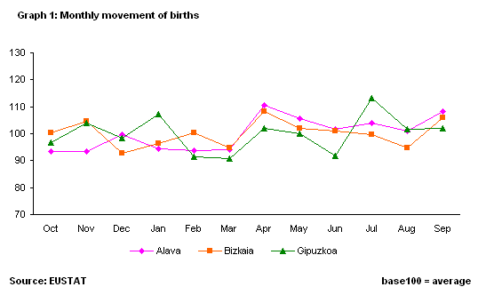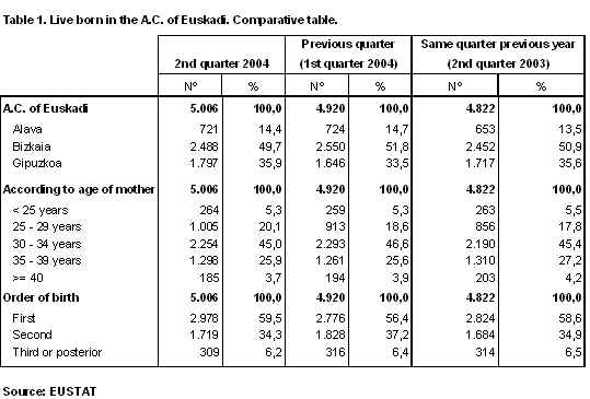 Birth Statistics data for the third quarter of 2004 prepared by the EUSTAT give a figure of 5,006 births in the A.C. of the Basque Country, which represents a 3.8% increase in relation to the same period the previous year. By provinces, 721 babies were born in Álava, with a 10.4% increase; in Gipuzkoa, with 1,797 births, the growth rate came to 4.7%, and Bizkaia registered lower growth, 1.5%, with 2,488 births.