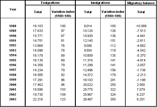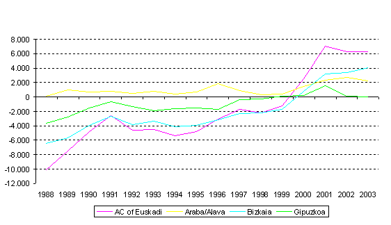 During 2003 6,251 more people came to the A.C. of the Basque Country than left, practically the same number as 2002, according to Eustat data. It was the fourth consecutive year with a positive migratory balance for the Community. By province, Bizkaia, which gained 4,020 people, presented the highest migratory balance in absolute terms, rising 17.4% in relation to the previous year. Álava, which gained 2,240 people through migration, saw its positive balance diminish by 17.3% with regard to the previous year. Gipuzkoa, in turn, lost 9 people.