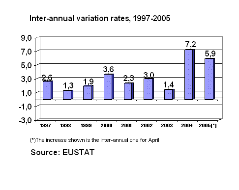 In April the highest growth in prices occurred for raw materials consumed by Explosives and gases (6.3%), Asphalt Products (3.7%), Cleaning and hygiene material (3.4%), Oil by-products (3.2%) and Hardware articles (2.0%), among others. On the other hand, there was a reduction in raw material prices for Electric energy (-7.8%), Structures and boilers (-1.0%), Plastic piping. Thermal insulation (-0.7%) and Iron and steel (-0.5%).