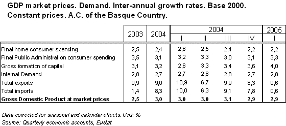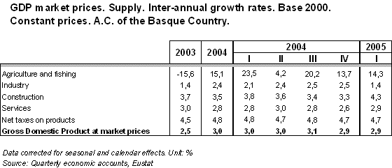 By provinces, GDP increased 3.0% in Bizkaia in the first quarter of 2005, 2.8% in Gipuzkoa and 2.7% in Alava, all of which are inter-annual rates.